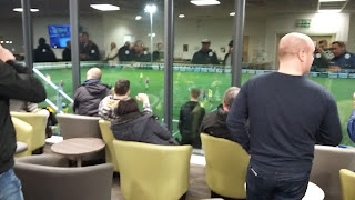 This was my first visit to watch Paulton Rovers and I was impressed with the set up. To our left as we came in was a big club house complete with two function rooms and a number of pool tables and a full size snooker table. On the same side of the pitch as the club house was two seated stands, one was a lovely looking raised stand, perched on top of some changing rooms. On the opposite side was a long and narrow terrace with brick benches built in to it, with a smart looking metal roof matching the one on the stand behind the goal. The only end to let the ground down a bit was behind the other goal, where there didn't seem to be anything other than a shiny metal fence.